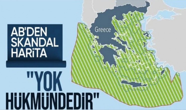 Avrupa Birliği’nin hazırladığı haritada, Yunanistan’ın kara sularının 12 mil olarak baz alındığı ve adaların referans noktası olarak kullanıldığı görüldü. Bu yöntemle Türkiye’nin deniz alanları büyük ölçüde dışlanarak, Ege ve Akdeniz’deki kıta sahanlığı Yunanistan lehine gösterildi.