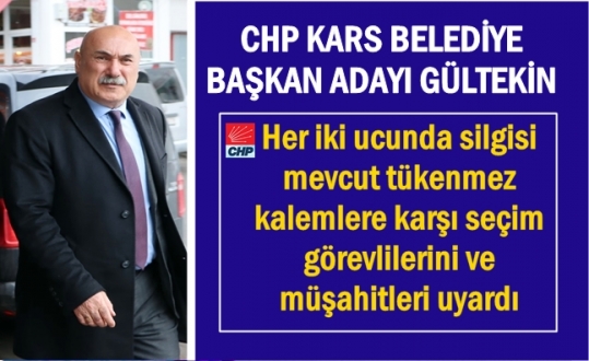 CHP Kars Belediye Başkan Adayı Dündar Gültekin, her iki ucunda silgisi mevcut tükenmez kalemlere karşı seçim görevlilerini ve müşahitleri uyardı.