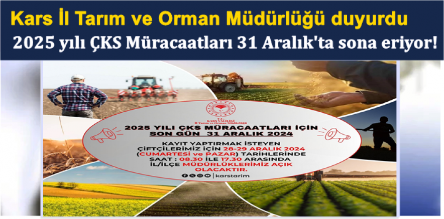 Kars İl Tarım ve Orman Müdürlüğü, ÇKS başvurularının 31 Aralık 2024 tarihinde sona ereceğini duyurdu.