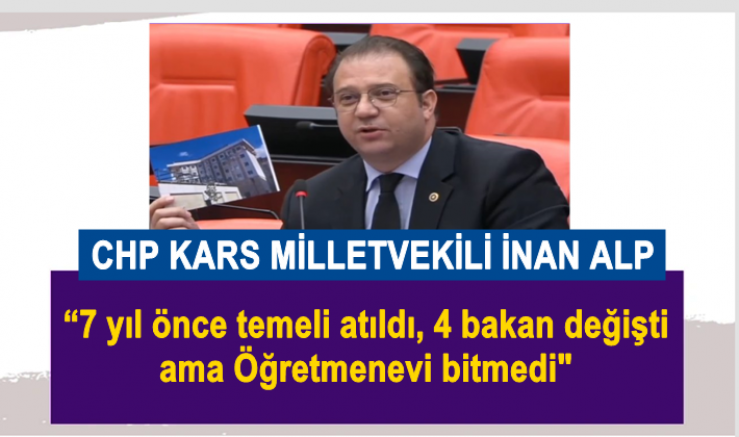 CHP Kars Milletvekili İnan Akgün Alp, Kars Kağızman Öğretmenevi’ni Meclis’e taşıdı. Meclis Genel Kurulu’nda konuşan CHP’li Alp, 7 yıl önce temeli atılan Öğretmenevi binasının hala inşaat halinde olmasına tepki göstererek, “ Ak Parti Kars'a bitmeyen öğretmenevi yapmış. Bu binanın temeli 2017 yılında atıldı, o zaman Bakan İsmet Yılmaz'dı; bina bitmedi. Ziya Selçuk geldi, binayı bitiremedi; Mahmut Özer geldi, bina bitmedi. Şimdi Yusuf Tekin geldi, bina hâlâ inşaat hâlindedir” dedi.