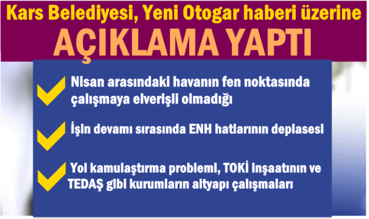 Kars Belediye Başkanlığı’nca yapılan yazılı açıklamada, “Bazı internet haber sitelerinde ve sosyal medya hesaplarında “Kars yeni otogar binası neden bitmiyor?” başlığıyla bilgi kirliliğine sebebiyet verecek şekilde yapılan paylaşımlar Belediye Başkanlığımızca incelenmiş olup, yapılan paylaşımlar üzerine açıklama yapma gereği duyulmuştur” denildi.