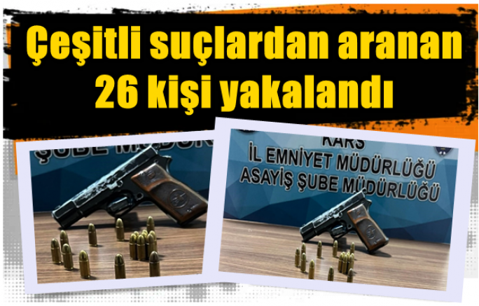 Kars İl Emniyet Müdürlüğü Asayiş Şube Müdürlüğü’nce yapılan çalışmalarda; Kasten Yaralama ve Adam Öldürme suçundan 33 yıl 5 ay 20 gün hapis cezası bulunan E.Ü. (35), Kasten Öldürmeye Teşebbüs suçundan 14 yıl hapis cezası bulunan E.Ç.(49), Bina İçerisinde Muhafaza Altına Alınmış Eşya Hakkında Hırsızlık suçundan 8 yıl 6 ay hapis cezası bulunan A.D.(34), Bina İçerisinde Muhafaza Altına Alınmış Eşya Hakkında Hırsızlık suçundan 8 yıl 7 ay 15 gün hapis cezası bulunan C.Ç.(25), Silahla Tehdit suçundan 8 yıl hapis cezası bulunan K.Y.(38) yakalanarak gözaltına alındı.
