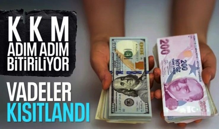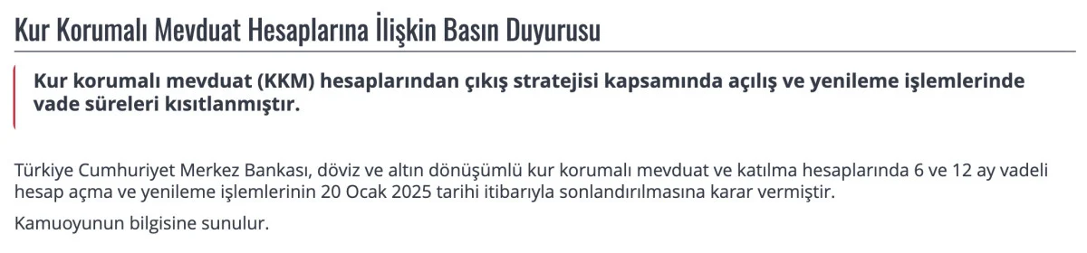"Kur korumalı mevduat (KKM) hesaplarından çıkış stratejisi kapsamında, açılış ve yenileme işlemlerinde vade süreleri kısıtlanmıştır. Türkiye Cumhuriyet Merkez Bankası, döviz ve altın dönüşümlü kur korumalı mevduat ve katılma hesaplarında 6 ve 12 ay vadeli hesap açma ve yenileme işlemlerinin 20 Ocak 2025 tarihi itibarıyla sonlandırılmasına karar vermiştir."