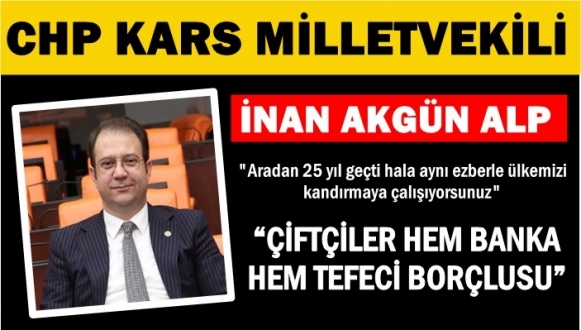 CHP'li Alp, Kars'ta çiftçilere kullandırılan 700 bin lira kredinin yarısının nakit diğer yarısını ise alışverişte kullanılmak üzere kredi kartına yüklenerek verildiğini bildirerek, "Siz uyguladığınız ekonomi politikasıyla benim çiftçimi hem banka kredisi borçlusu haline getiriyorsunuz hem de tefeci faizi borçlusu haline getiriyorsunuz" diye konuştu.