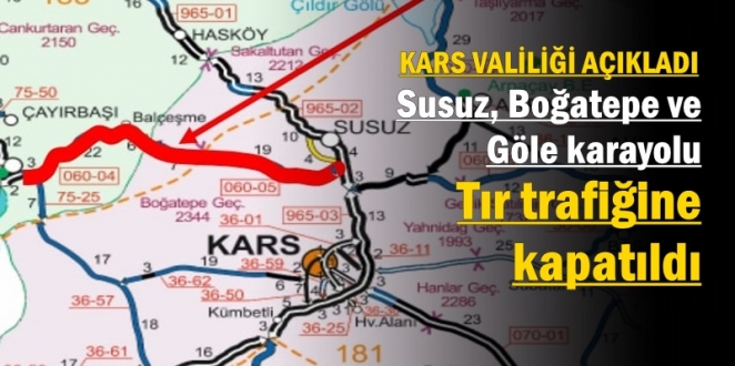 Kars Valiliğinden yapılan açıklamada, Susuz-Boğatepe-Göle Devlet yolunun tipi ve görüş olmaması nedeniyle tır trafiğine kapatıldığı açıklaması geldi. Yapılan açıklamada şu ifadeler yer aldı.
