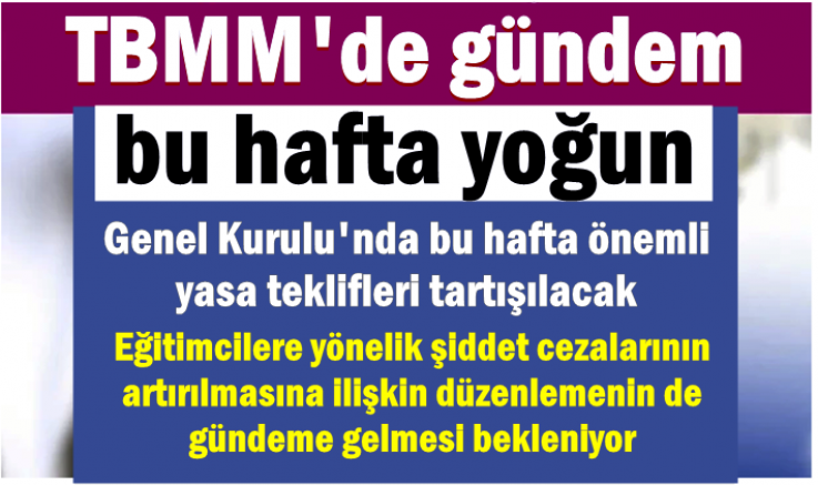 Türkiye Büyük Millet Meclisi Genel Kurulu'nda bu hafta önemli yasa teklifleri tartışılacak. Fahiş fiyat uygulamaları ile mücadeleye yönelik kanun teklifinin görüşmeleri devam ederken, eğitimcilere yönelik şiddet cezalarının artırılmasına ilişkin düzenlemenin de gündeme gelmesi bekleniyor.