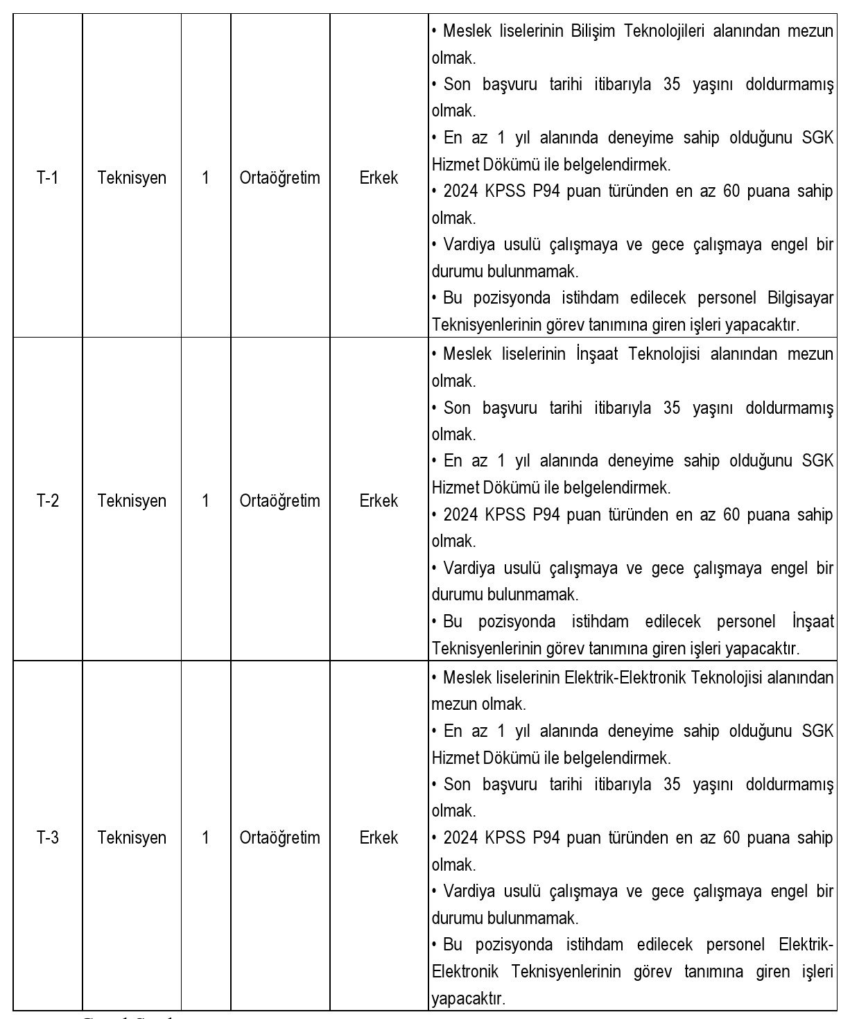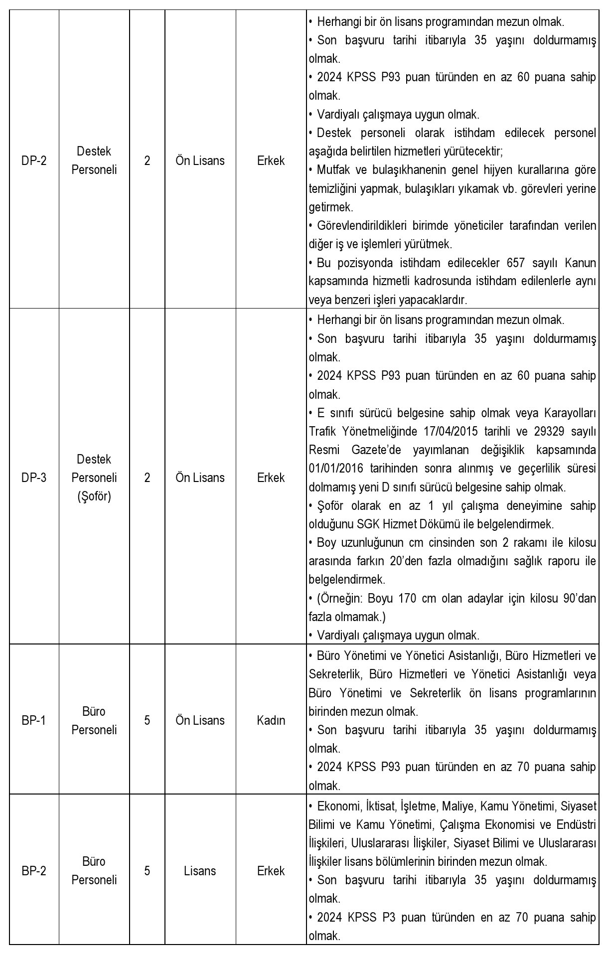 Destek personeli kadrolarının temizlik, mutfak ve şoför alanlarını kapsadığı belirtildi. Teknisyen alımında ise bilişim, inşaat ve elektrik alanlarının öne çıktığı görüldü.