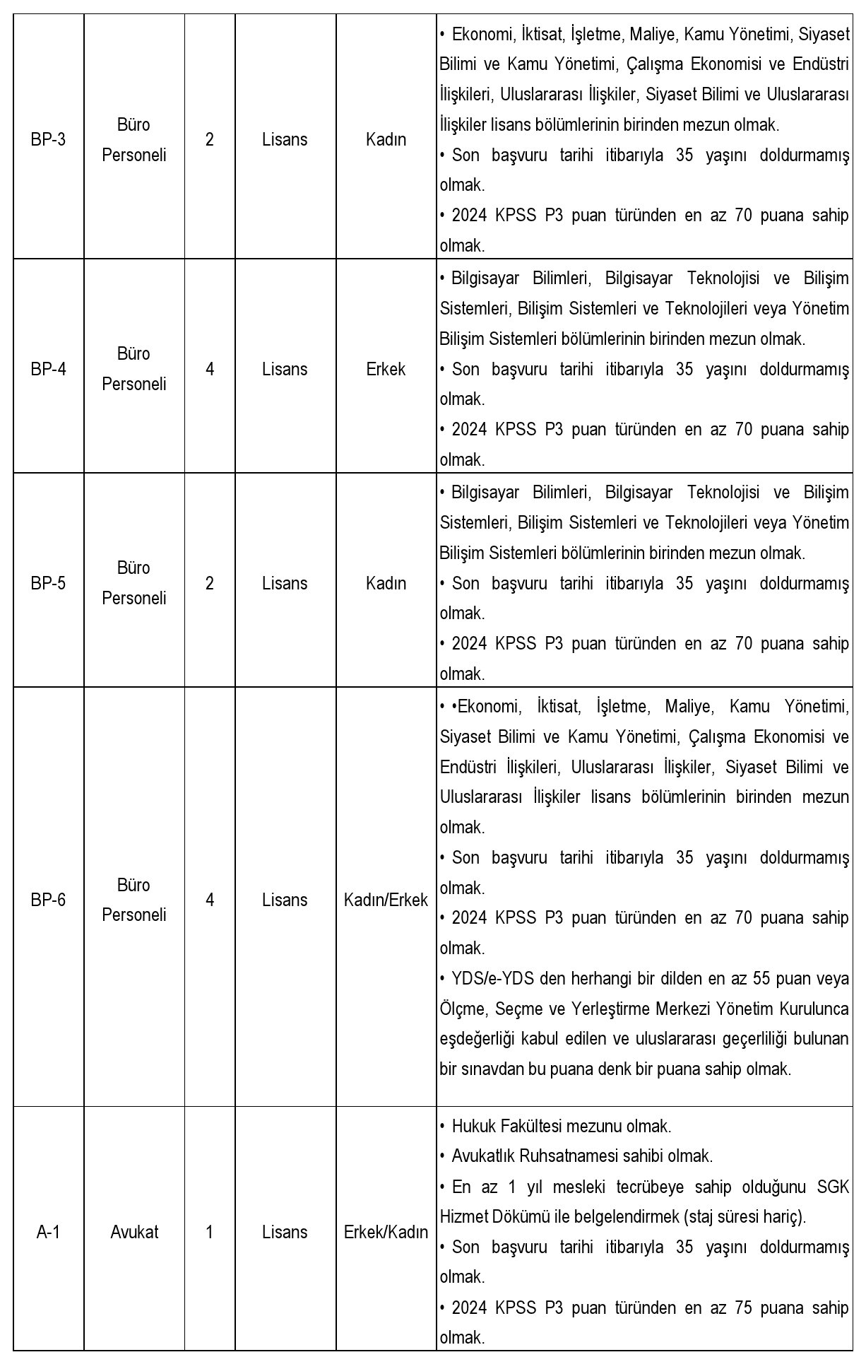 Avukat kadrosu için bu barajın 75 puan olarak belirlendiği açıklandı. Ayrıca tüm adaylar için 35 yaş sınırı, ilgili mezuniyet şartı ve bazı kadrolarda deneyim, sertifika ya da fiziksel yeterlilik gibi özel kriterler aranacak.